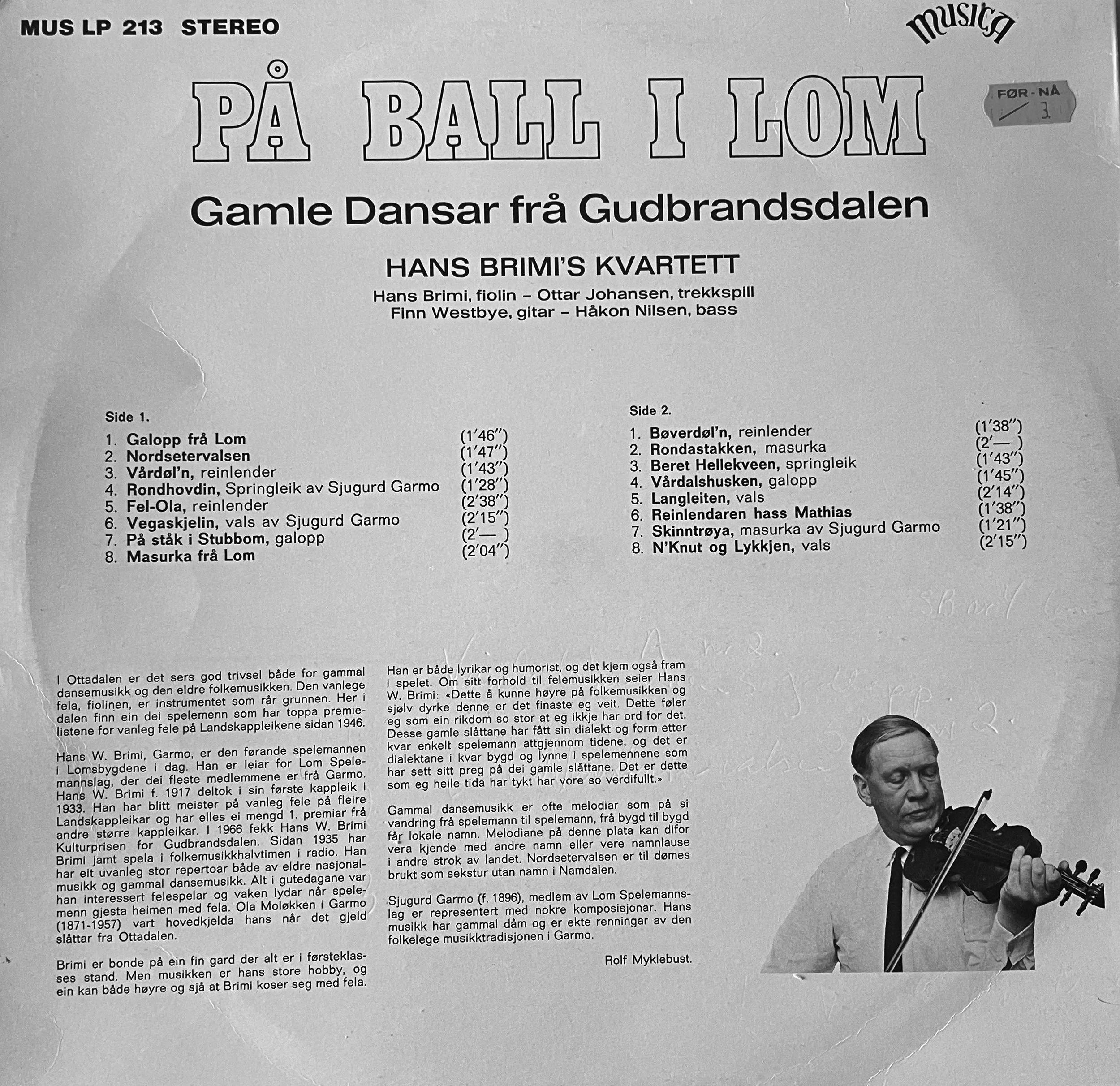 Medverkande: Hans W. Brimi, fele; Ottar Johansen, trekkspel; Finn Westby, gitar; Håkon Nilsen, bass.